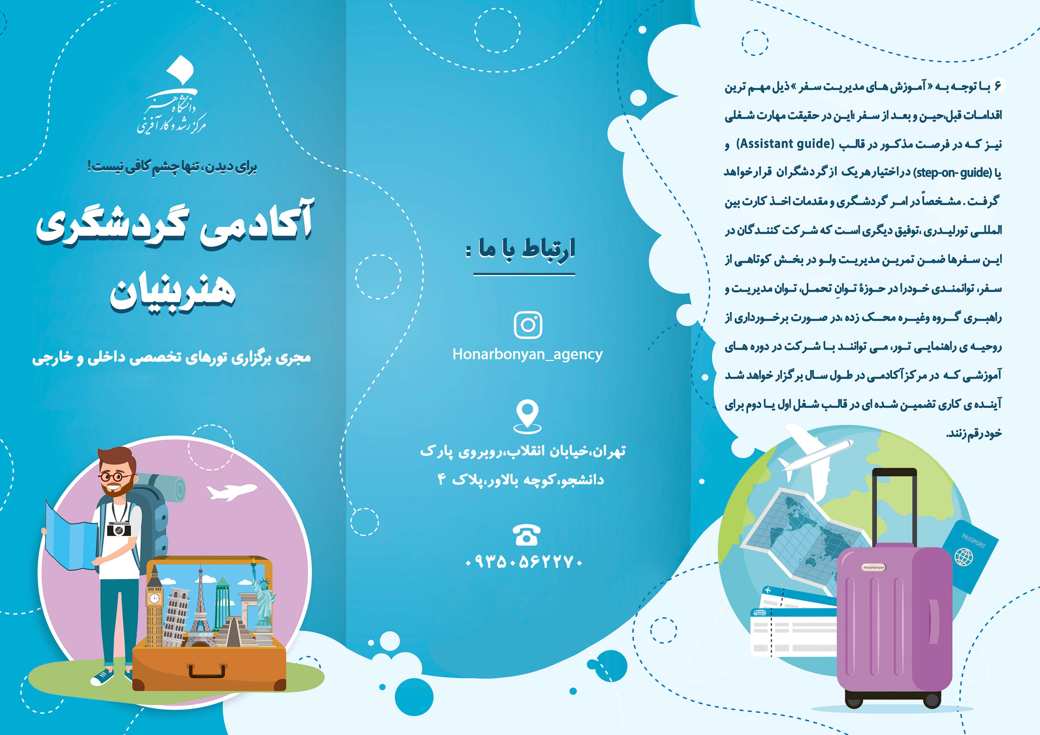 آکادمی گردشگری هنربنیان به عنوان یکی از واحدهای فناور مستقر در مرکز رشد و کارآفرینی دانشگاه هنر، سفرهای داخلی و خارجی خود را آغاز کرد. این آکادمی برنامه سفرهای علمی، فرهنگی و هنری خود در تابستان 1402 را به شرح پکیج های ذیل اعلام کرده است. علاقه مندان برای کسب اطلاعات بیشتر بر روی فایل های مربوطه کلیک کنند.