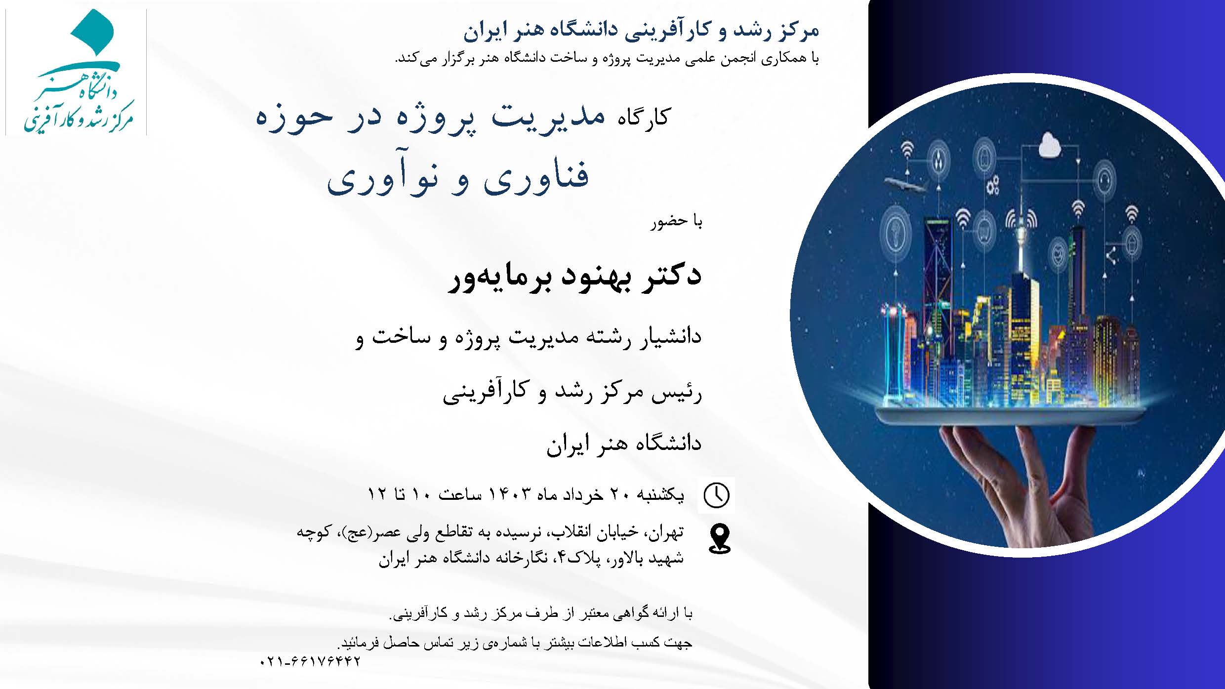 مرکز رشد و کارآفرینی دانشگاه هنر ایران برگزار می کند: کارگاه مدیریت پروژه در حوزه فناوری و نوآوری ۰۹ خرداد ۱۴۰۳ | ۰۸:۴۳ کد : ۶۲۵۲ اخبار و رویدادها ارسال به دیگران نام شما ایمیل شما ایمیل دریافتکننده ارسال انصراف تعداد بازدید:۴۵۹