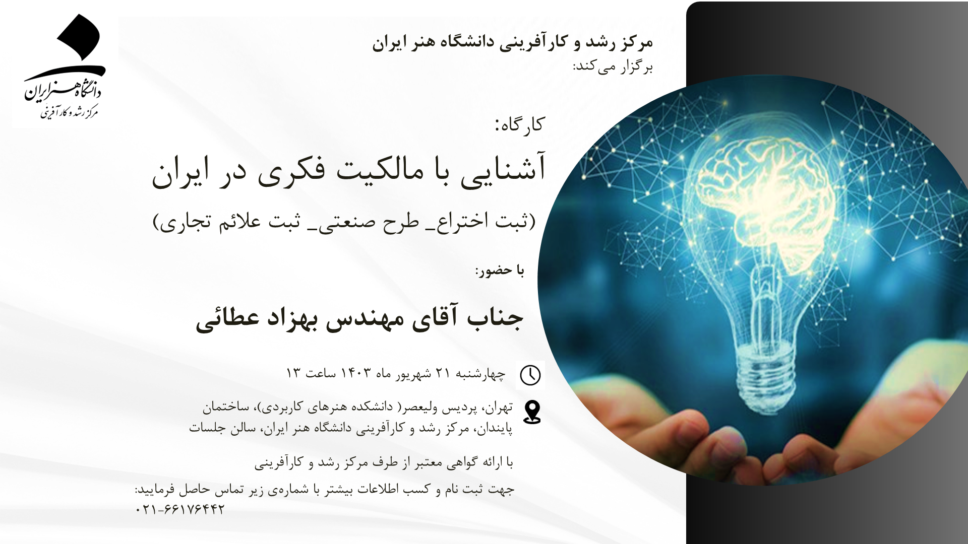 مرکز رشد و کارآفرینی دانشگاه هنر ایران برگزار می کند: کارگاه آشنایی با مالکیت فکری در ایران (ثبت اختراع- طرح صنعتی - ثبت علائم تجاری) ۰۶ شهریور ۱۴۰۳ | ۱۱:۱۴ کد : ۶۳۵۸ اخبار و رویدادها ارسال به دیگران نام شما ایمیل شما ایمیل دریافتکننده ارسال انصراف تعداد بازدید:۷۷