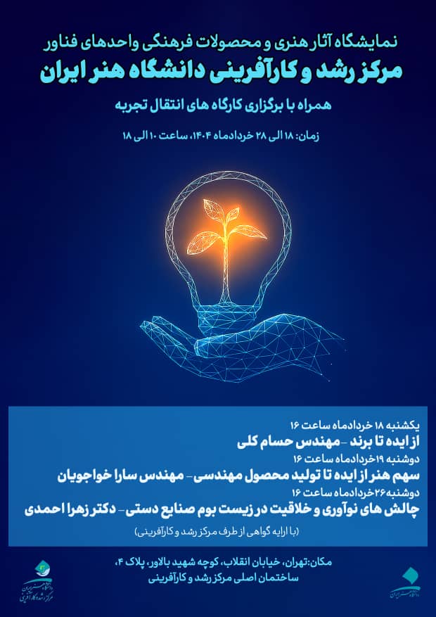 مرکز رشد و کارآفرینی دانشگاه هنر ایران برگزار می کند: نمایشگاه آثار هنری و محصولات فرهنگی واحدهای فناور ۱۱ خرداد ۱۴۰۴ | ۱۰:۴۶ کد : ۷۰۳۹ اخبار و رویدادها ارسال به دیگران نام شما ایمیل شما ایمیل دریافتکننده ارسال انصراف تعداد بازدید:۱۸۹